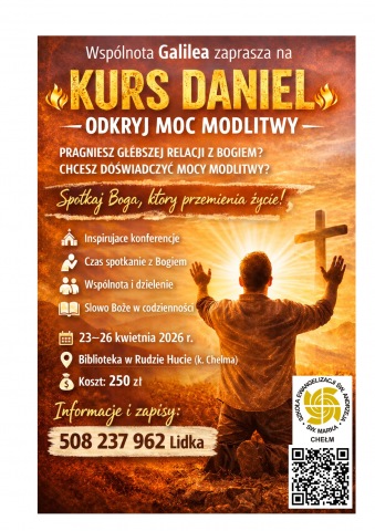 Zapraszamy Cię na Kurs Daniel – kurs o modlitwie, prowadzony przez Wspólnotę Galilea. To wyjątkowe rekolekcje, które pomagają odkryć, że modlitwa nie jest obowiązkiem, ale żywym spotkaniem z Bogiem, który mówi, prowadzi i działa w codzienności.